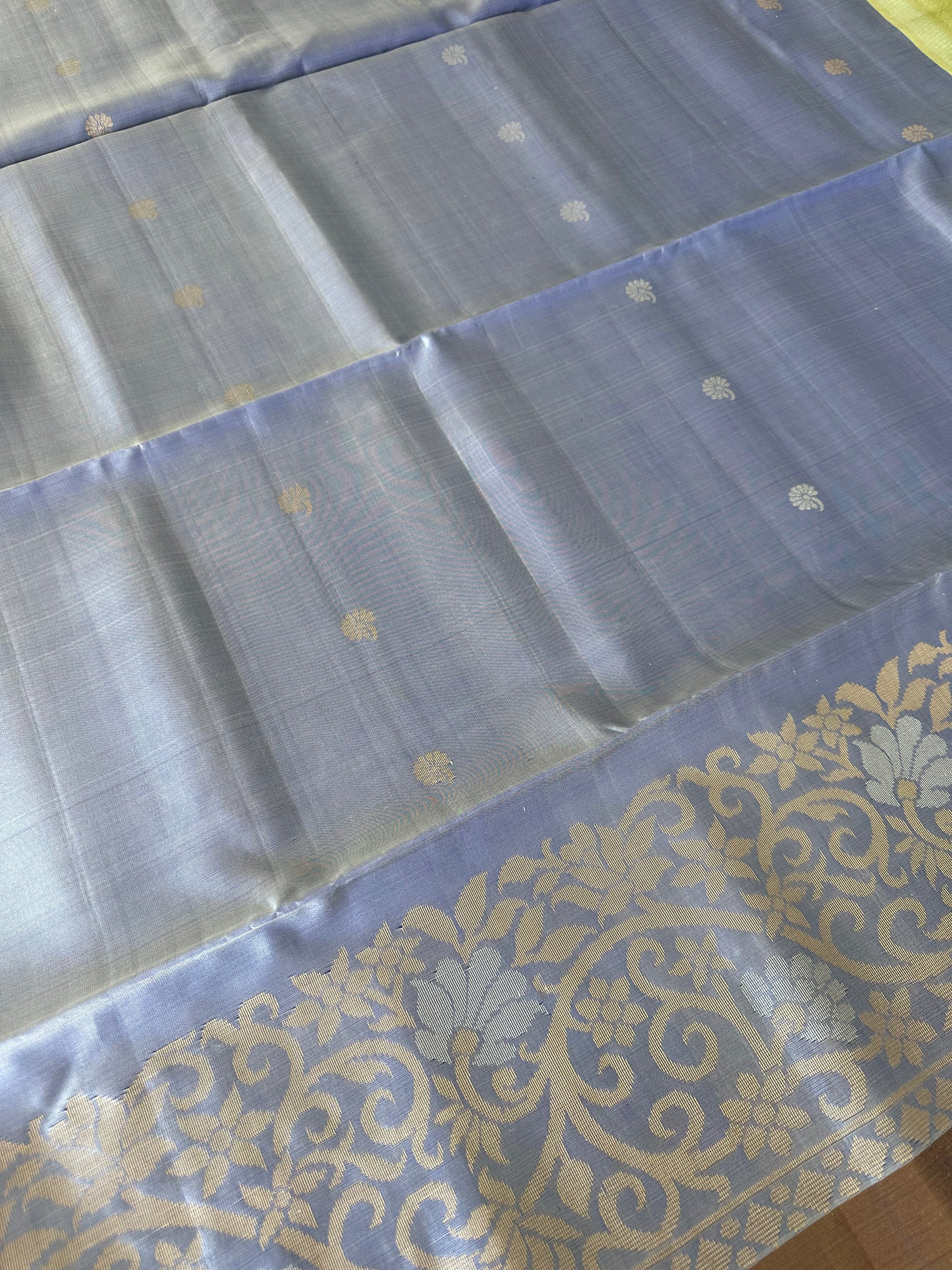 - Lightweight with a soft sheen, adorned with a contrast pallu and gold zari border